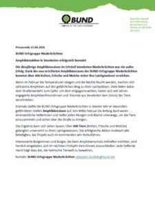 Die BUND Ortsgruppe Niederkrüchten informiert nun über den großen Erfolg dieser Maßnahme: „Amphibienaktion in Venekoten erfolgreich beendet“ [siehe HIER].